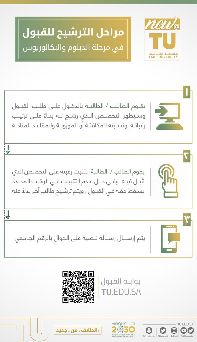 جامعة الأمة للعلوم والتكنولوجيا منظومة متكاملة من الكليات العلمية والإنسانية، تتكون من المجموعة الطبية وتضم (3) كليات على الطالب أن يستوفي شروط القبول في الجامعة وشروط الكلية المراد الالتحاق بها. أعلنت جامعة الطائف مواعيد فتح بوابة القبول والتسجيل في برامج (البكالوريوس، والدبلوم، والتجسير)، للعام الدراسي 1441/1440هـ، مع ضرورة مراعاة دقة وصحة المعلومات التي يدونها المتقدم في طلب الإلتحاق، علماً بأن التعديل متاح خلال الفترة المعلن عنها ضمن البرنامج. شروط القبول لبرنامج السنة التحضيرية لكلية العلوم الطبية التطبيقية طالبات الطائف (بنات). جامعة الطائف هي من الجامعات الكبرى العريقة على مستوى المملكة, حيث يتم استخدام أحدث التكنولوجيا في الوسائل التعليمية, مع وجود أفضل أعضاء هيئة التدريس من أساتذة ومحاضرين ومعيدين وفنيين ذوي الاختصاصات والخبرة العالية. أن يكون قد أنهى فصلاً دراسياً واحداً في الجامعة أو الكلية.